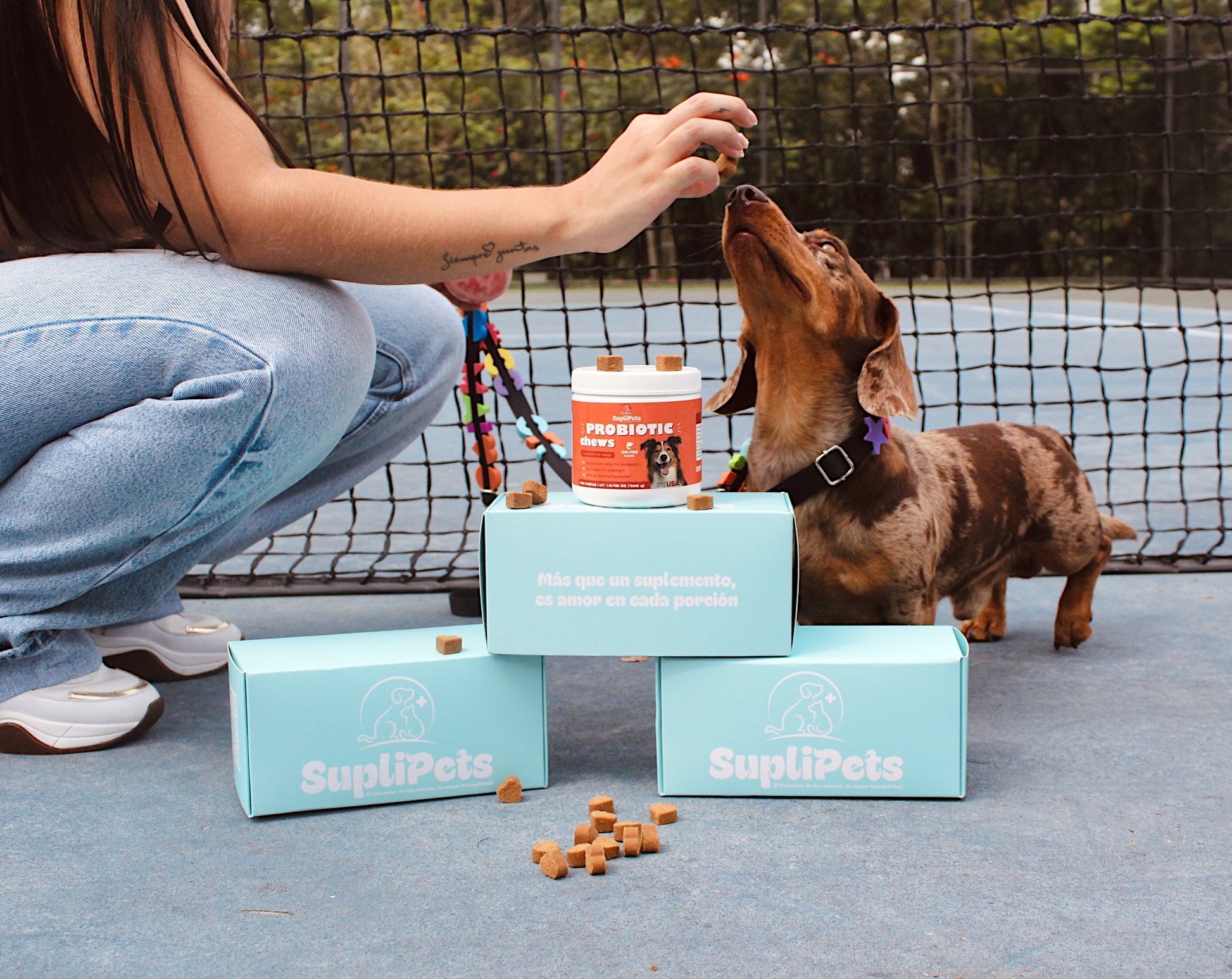 Probióticos con sabor a salmón real diseñado para mejorar la digestión de tu perro, reducir gases y fortalecer sus defensas desde el intestino.